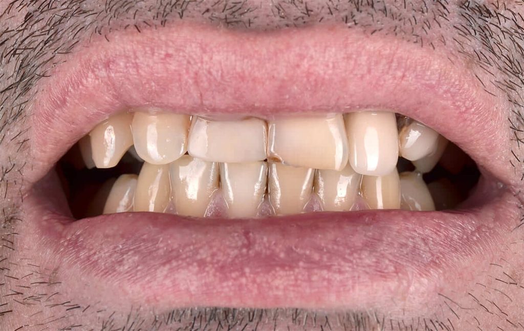 - Many years ago, the patient got his teeth chipped due to a boxing injury. Later, endodontic treatment of 11, 22, 23 teeth was performed. The 22 tooth was replaced with a porcelain-fused-to-metal crown.