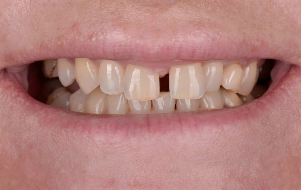 - It was a challenging task to close the gap (diastema) between the central incisors without orthodontic treatment and create a symmetrical gingival margin of the upper jaw.