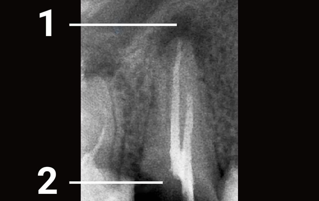 - The patient contacted the clinic due to tooth decay, which was previously treated in another clinic. Some damaged bone tissue was discovered on the top of the root canal. 1 - bone tissue was damaged due to an incomplete treatment of the root canal 2 - crown of the tooth is damaged